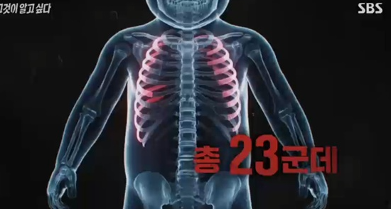 그외에도 뇌출혈, 신체 곳곳에서 20여 곳 이상의 골절이 발견되었고 일부는 시간 차이가 있는 골절로 추정되며 반복적인 폭행 가능성이 제기되었습니다. 그리고 몸 전체에서 색이 서로 다른 멍이 발견되었어요..