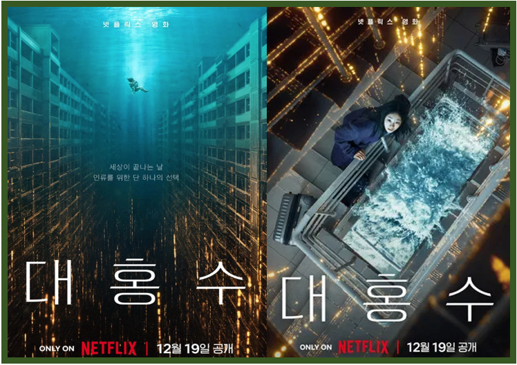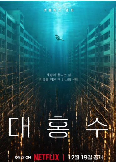 영화 <대홍수>는 한국 재난 영화의 기술력을 한 단계 끌어올렸다는 평을 받는데요, 특히 물의 질감과 폐쇄공포를 극대화한 연출이 뛰어납니다. 다만, 후반부 SF 설정으로의 급격한 전환은 관객에 따라 다소 어렵거나 난해하게 느껴질 수 있습니다.