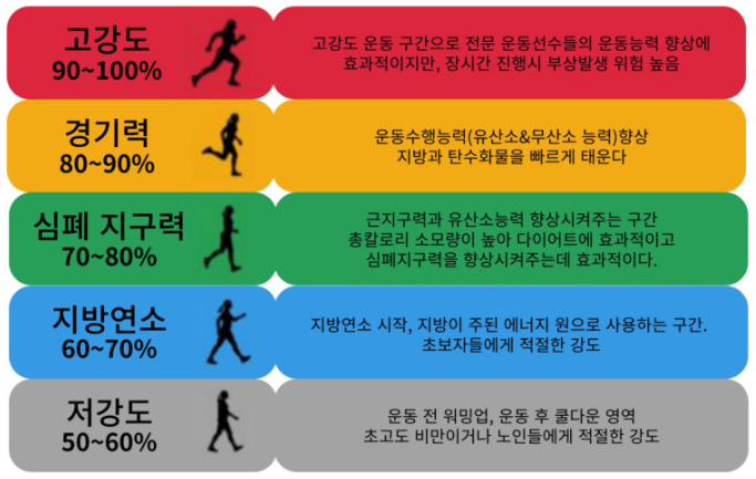 예를 들어, 40세라면 최대 심박수가 180이고, 이의 60~70%인 108~126회 사이를 유지하며 운동하는 것이 베스트입니다.
