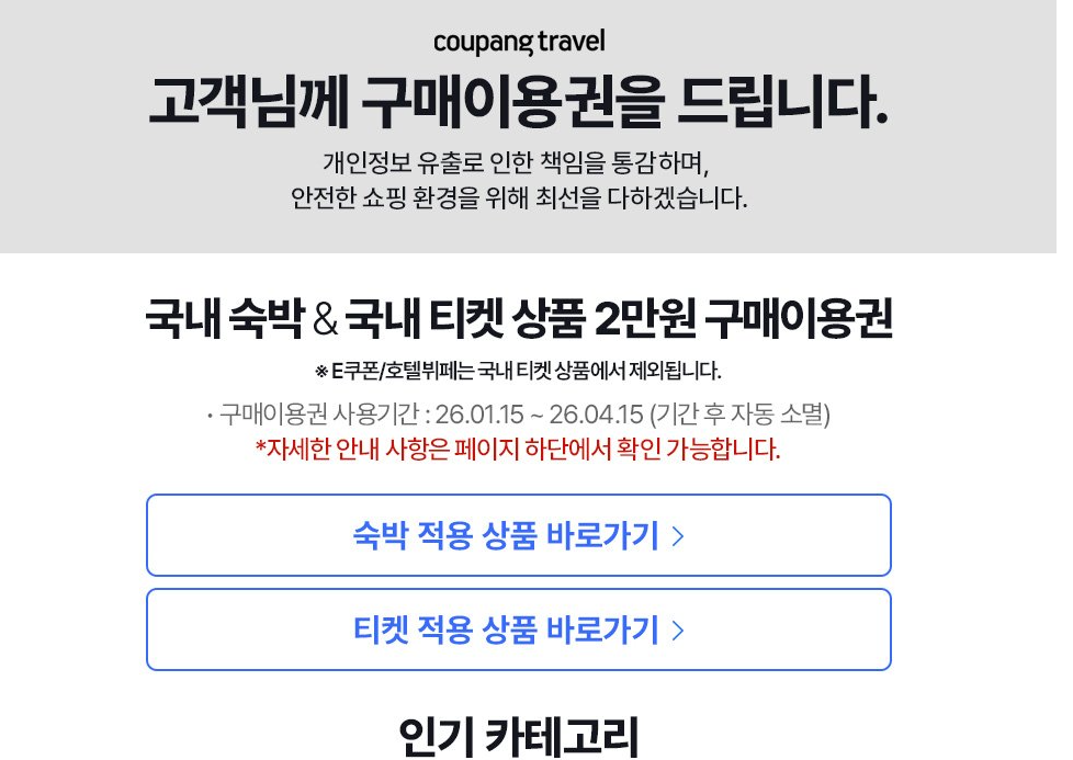 - 쿠팡 트래블: 20,000원 (국내 숙박 및 티켓 전용)