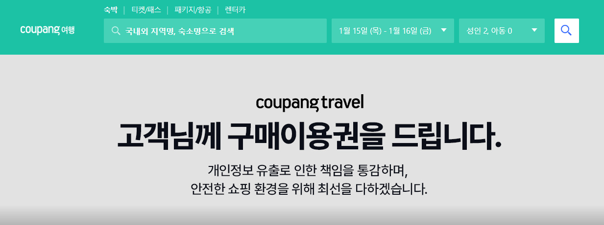 쿠팡트래블을 클릭해서 들어가면 다음과 같이 화면에 뜨는데요.