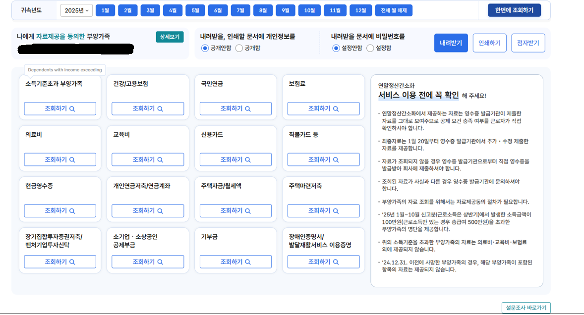 - 1월 20일 이후: 간소화 서비스에서 조회되지 않는 영수증(안경 구입, 교복 구입 등) 직접 챙겨서 회사에 제출.